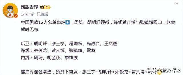 中国男篮首战12人名单是:廖三宁、胡明轩、程帅澎、王岚钦、高诗岩、朱俊龙、雷蒙、张镇麟、曾凡博、周琦、胡金秋、李祥波。