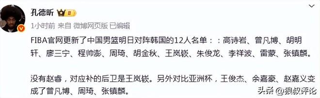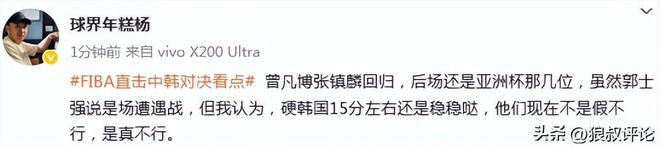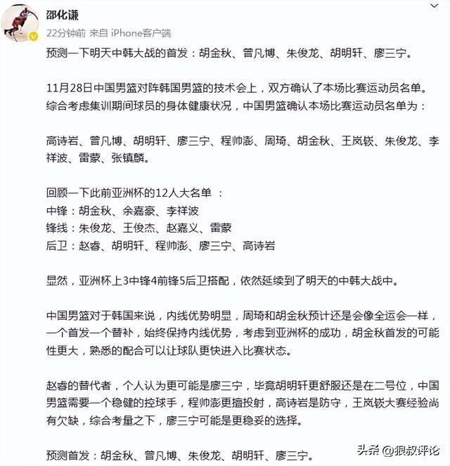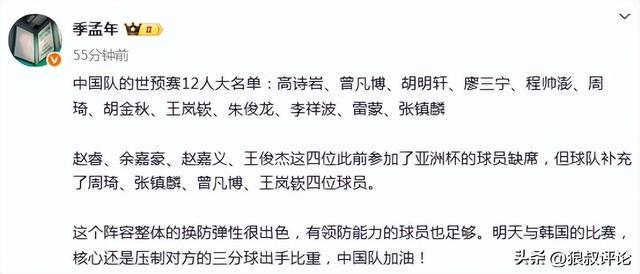 篮球记者“季孟年”发文点评:这个阵容整体的换防弹性很出色,有领防能力的球员也足够。明天与韩国的比赛,核心还是压制对方的三分球出手比重,中国队加油。
