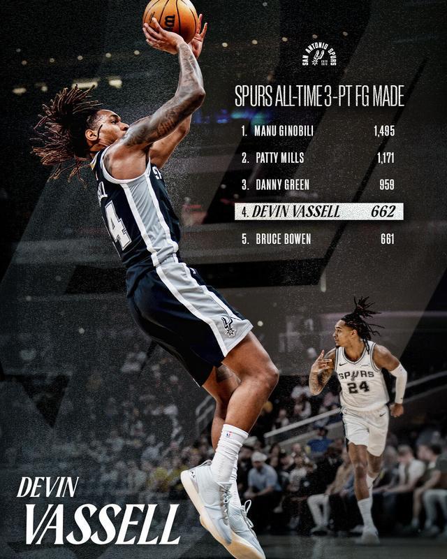据统计,本场比赛过后,瓦塞尔的生涯三分球命中数正式超越马刺名宿布鲁斯-鲍文,升至队史第四位。