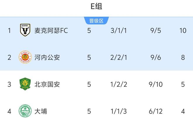 5轮过后的小组排名,国安1胜2平2负积5分仍然排在第3,落后第2的河内公安3分且相互战绩处于劣势,在小组赛仅剩1轮的情况下已经无法反超对手,无奈与垫底的大埔队提前1轮出局。10分排在小组第1的麦克阿瑟FC与8分的河内公安携手出线。