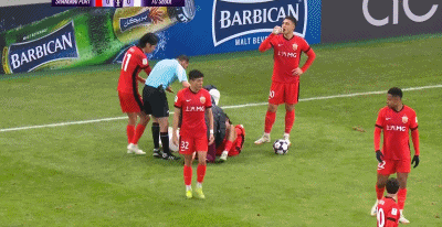 第33分钟,李新翔被对手放倒,队医入场治疗